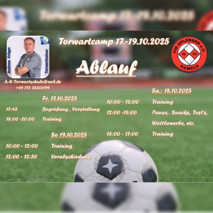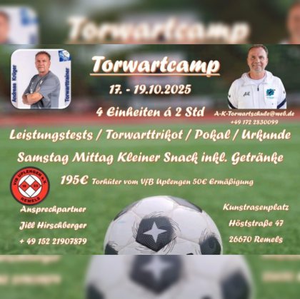 Nach dem Erfolg des ersten Camp im April 2025, bieten wir jetzt das zweite Torwartcamp , in der Zeit vom 17.10. - 19.10.2025 bei VfB Uplengen in Ostfriesland an. Übernachtungsmöglichkeiten auf Anfrage vorhanden. Wir freuen uns drauf........
